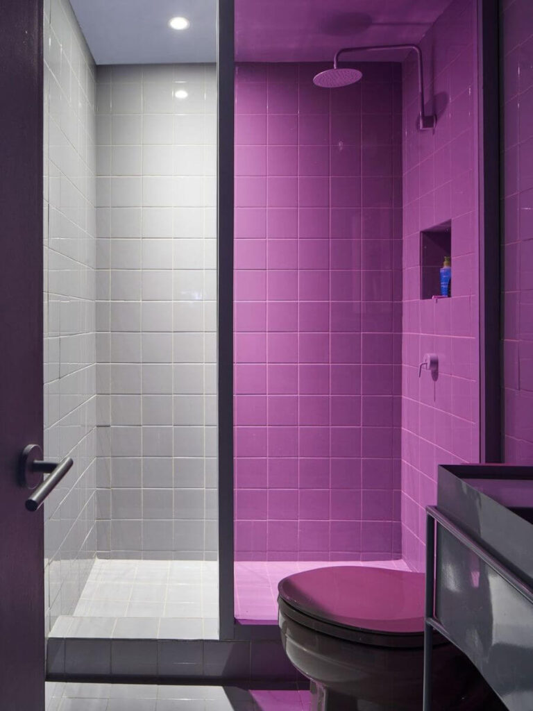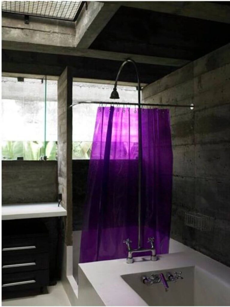 Accessories only work when they echo colors found in something larger. Or, they match and add to the vibe, like this purple shower curtain!