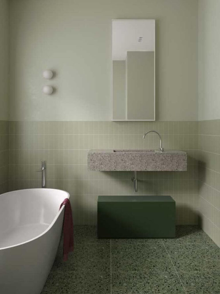The most defining surface in any bathroom. If the bathroom has light colors, I would not choose a strong colors for (only) wall tiles. Think about tiles and wallpaint ratio – how high is your bathroom tiled? What is the vibe of the color?