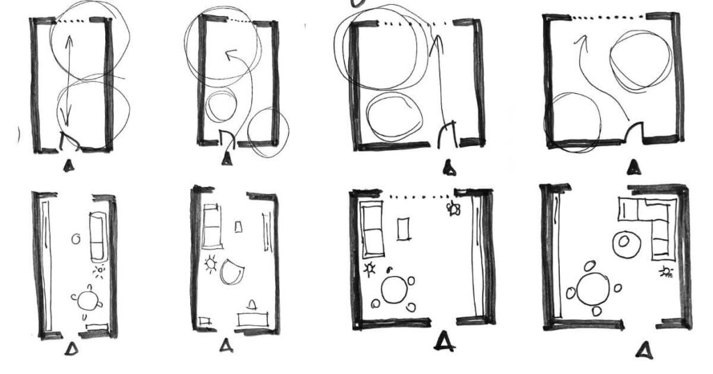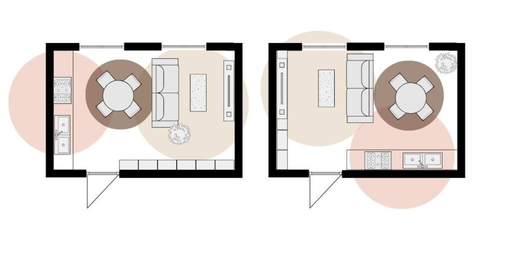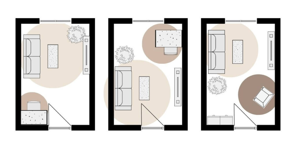 - Furniture orientation – what each zone faces