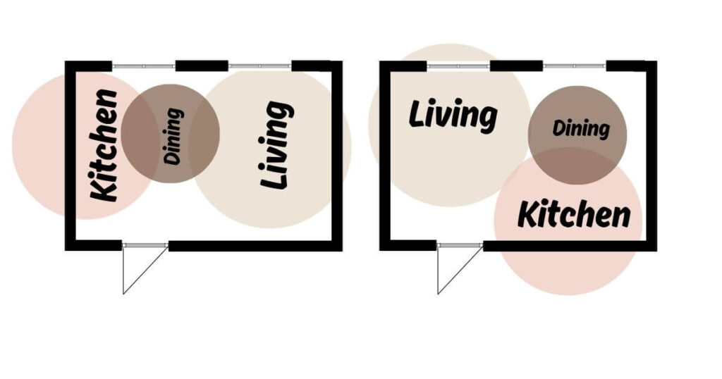 - Living room seating should not face the kitchen worktop directly unless it’s intentional
