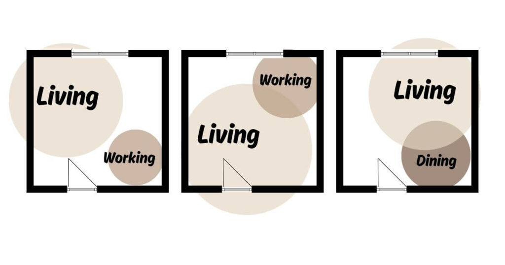 For example, a long rectangle living room layout might suit a work + relax scenario, while a square living room layout may handle social + dining better. But this is not an universal truth, just an easy scheme.